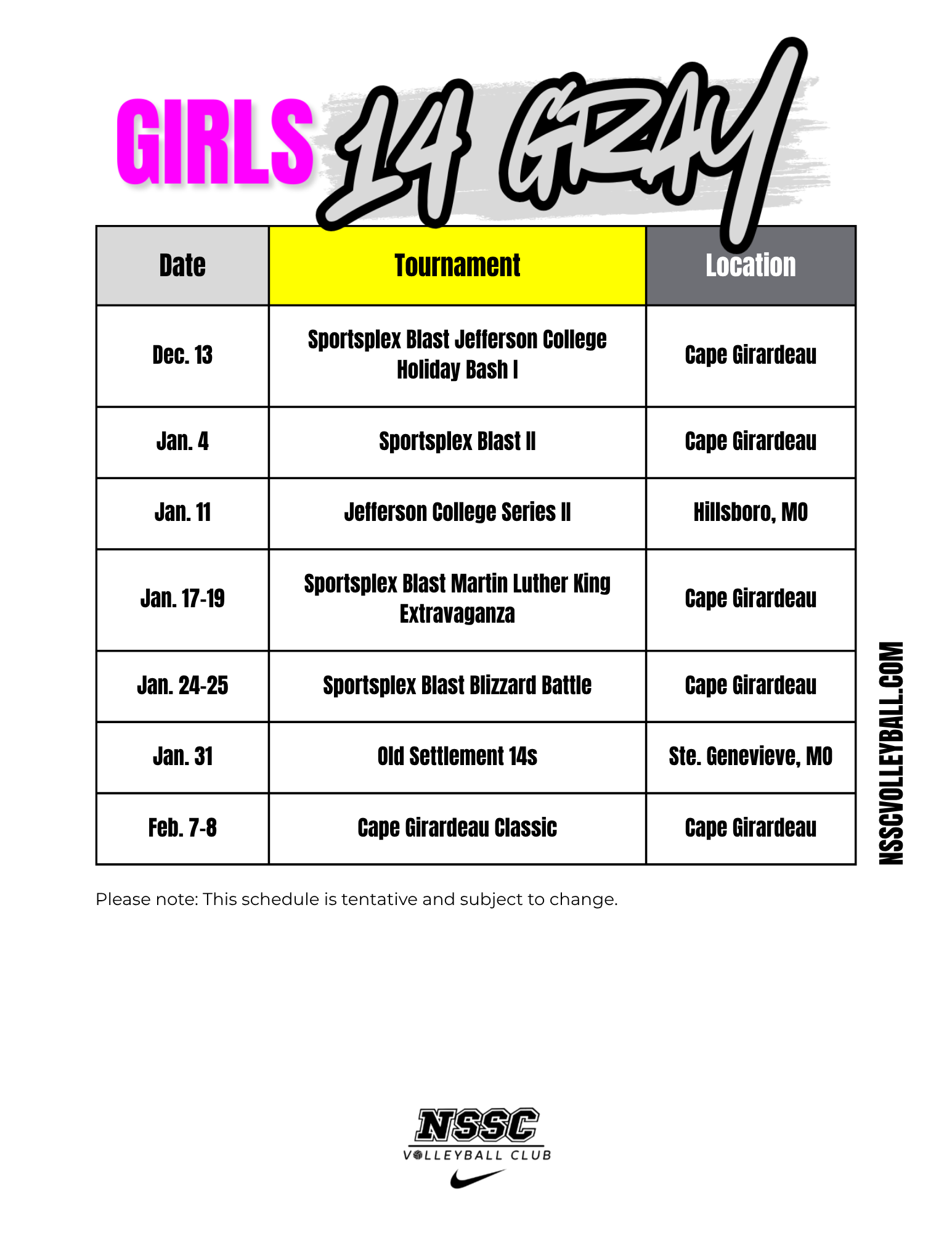 Sportsplex Blast Jefferson College Holiday Bash II – December 15th, 2024 NSSC 14 Gray Pool Play Results:NSSC 14 Gray RosterSilver Bracket ResultsFinal Tournament Results NSSC 14 Gray Pool Play Results: LOSS: JC Crush 14U (25-18, 25-19) TIE: ND Heat Wave (25-15,...