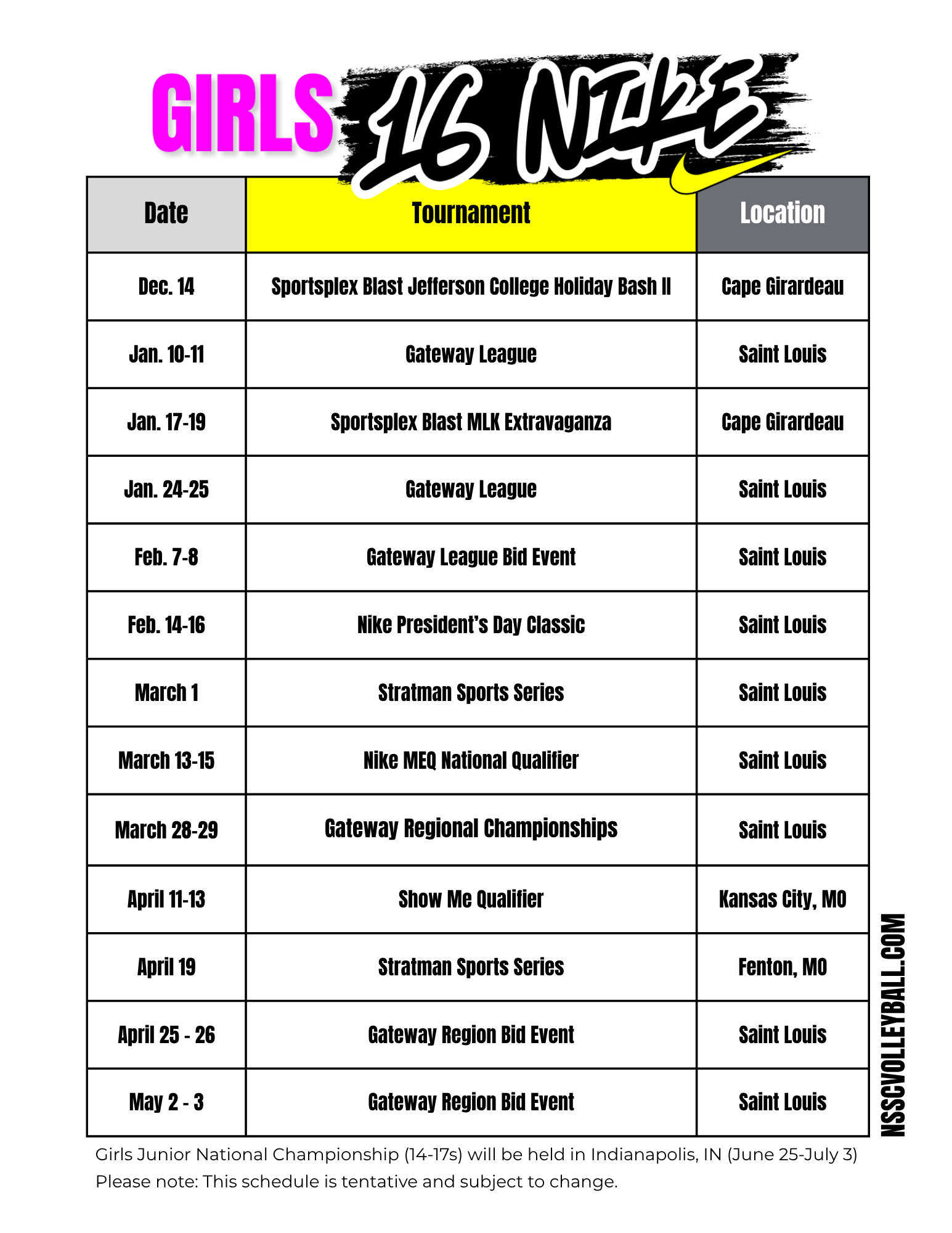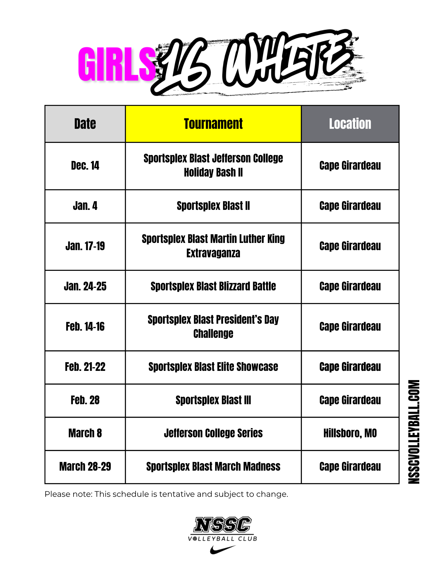 Please note that these schedules are tentative and may change due to tournament availability and potential scheduling conflicts.